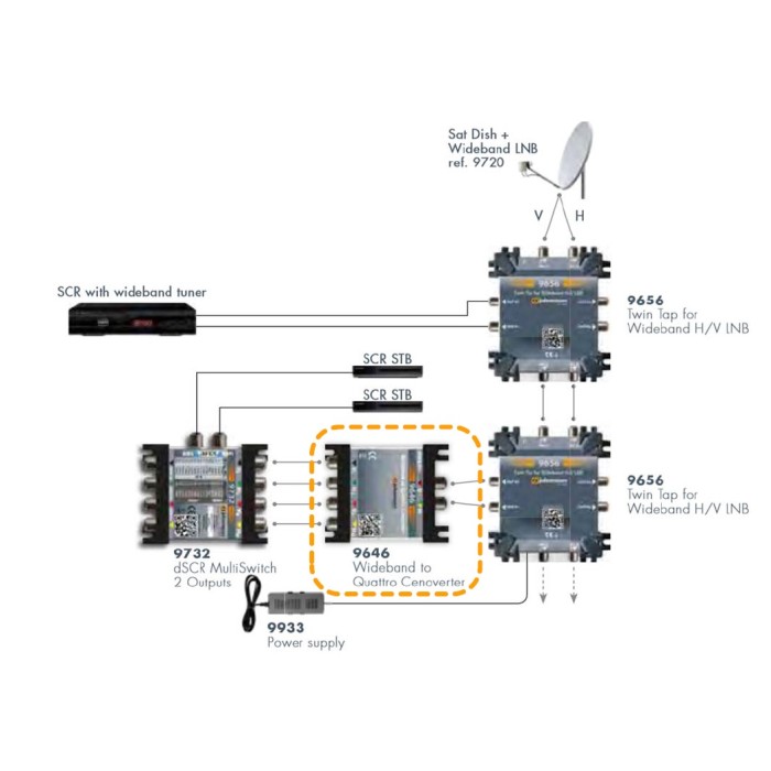 Ο Johansson 9646 - είναι ένας μετατροπέας Wideband σε Quattro που μετατρέπει ένα Wideband LNB (V, H) σε quattro LNB (VL, HL, VH, HH). DC pass μέσω VL για την τροφοδοσία του wideband LNB. Ιδανικό για συστήματα με ένα συνδυασμό νέων wideband Set-Top-Boxes και άλλων Set-Top-Boxes.