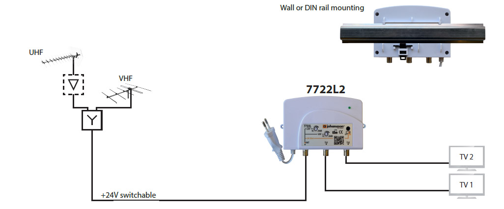 Johansson 7722L2 is a line amplifier with 1 input (40-320+ 470-694 MHz) and 2 outputs. With built-in LTE/5G filter.