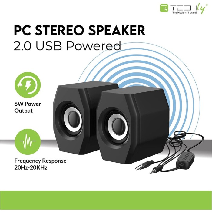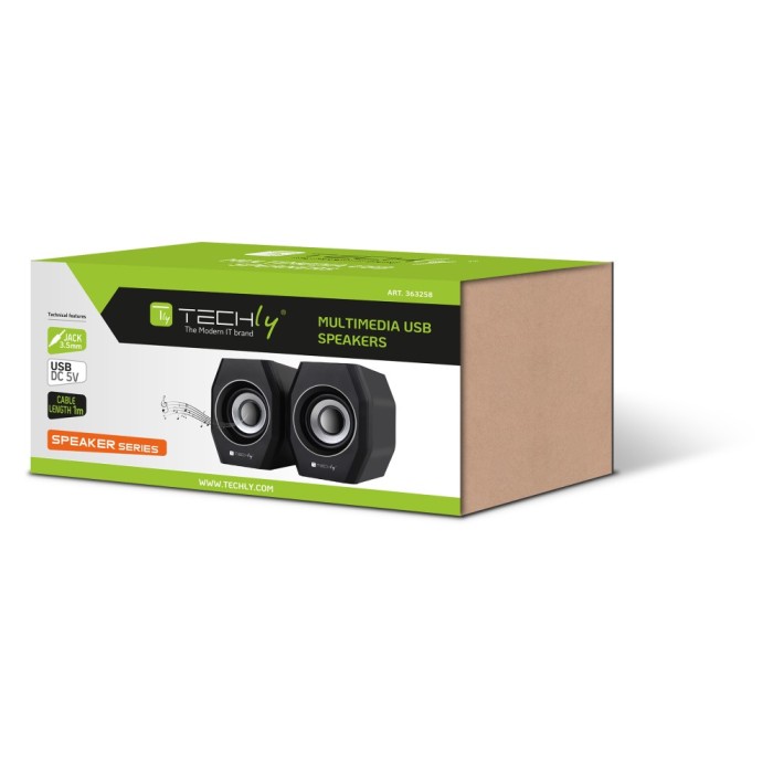Techly ICC SP-320STY are USB 2.0 powered desktop speakers. Perfect audio speakers for any type of environment such as home and office or ideal for traveling thanks to their small size. Simply connect your devices via the 3.5mm AUX input for audio playback and USB for power. Built-in volume control on the power cable for easy adjustment of your music.