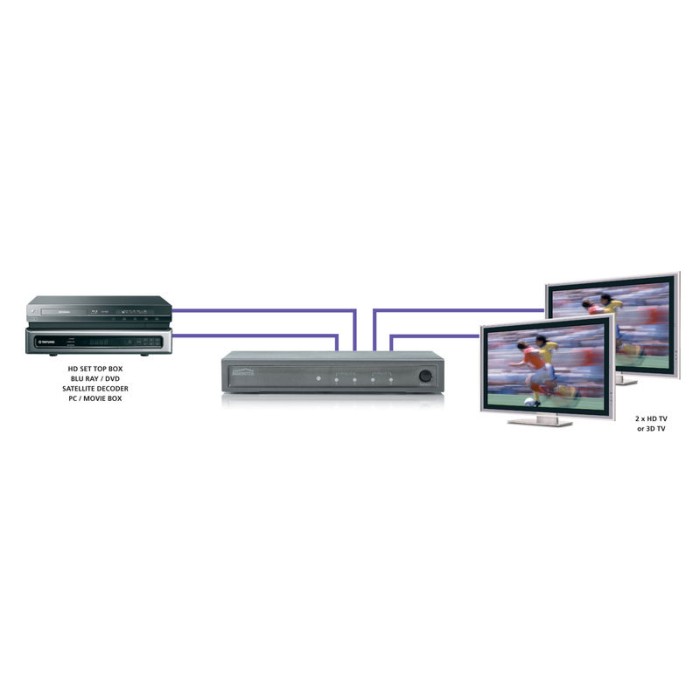 - Enables image and sound from your HD satellite receiver, set-top box, games console or Blu-ray Player to be simultaneously shown on 2 screens (HDTV or HD projector).