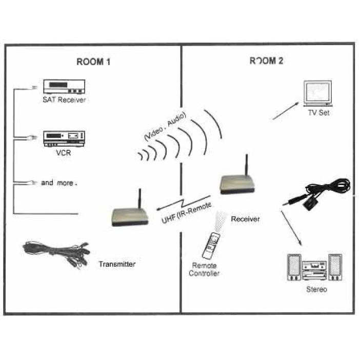 The set comprises a transmitter and a receiver. Connect the transmitter to the SCART output of your AV device (decoder, DVD). Then connect the receiver to the TV. The set sends on the picture, sound and commands from your remote control wirelessly.