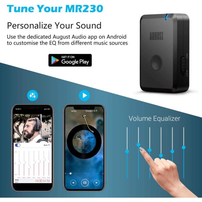 August MR250Bluetooth Wireless Transmitter The August MR250 is a Bluetooth Transmitter that enables you to play Music wirelessly from your TV or Home Theatre System to your Bluetooth Headphones or Bluetooth Speakers. The MR250 has a range of about 10..