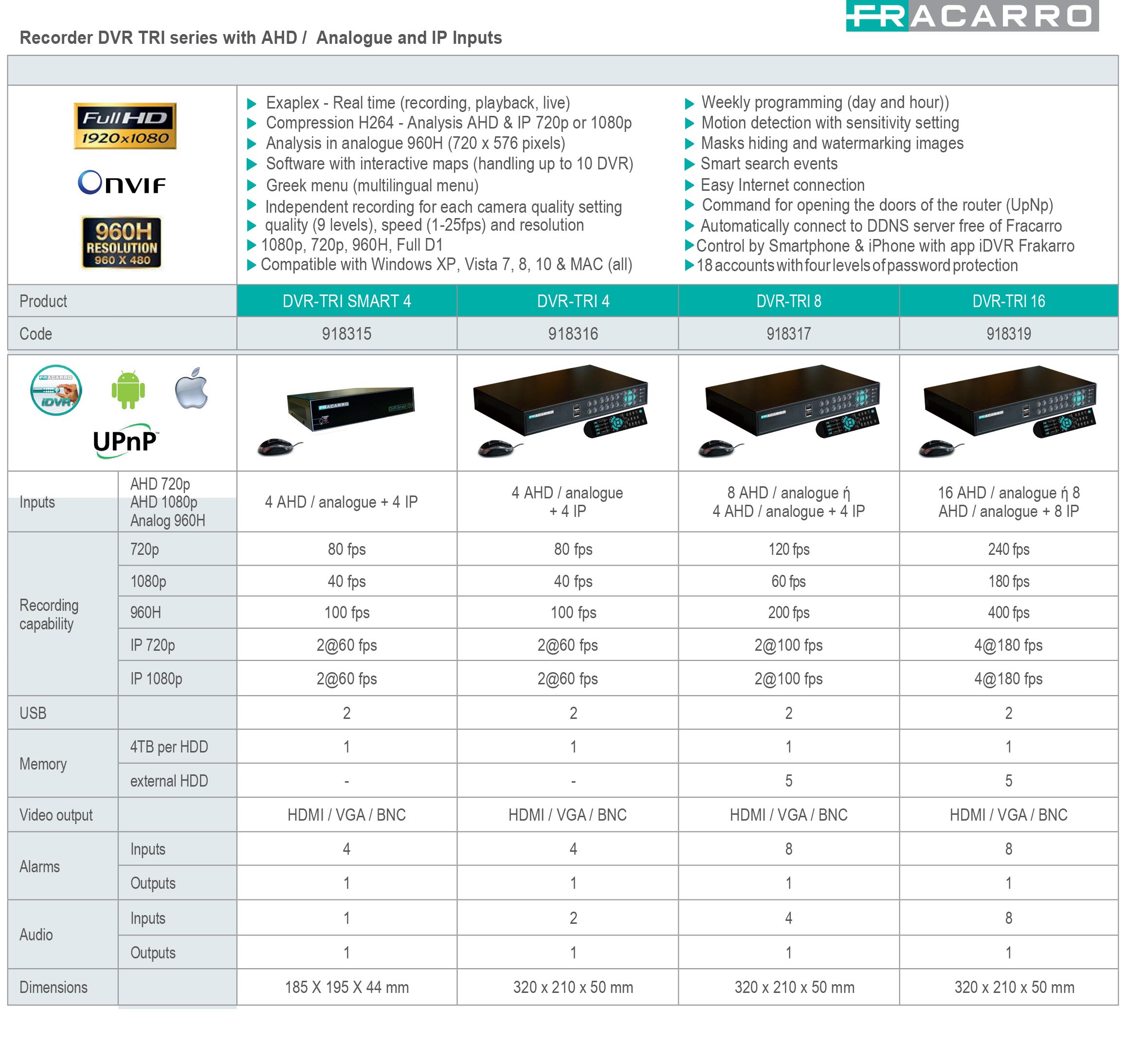 The Fracarro DVR-TRI recorders represent the ideal solution for all types of AHD or hybrid systems because the same system is capable to handle cameras with different technology (analog, AHD, IP). The device control is very simple with an intuitive icon-based menu, common to all the Fracarro DVR. TThe free Fracarro iDVR application also allows convenient management of the system even from iOS and Android mobile devices.