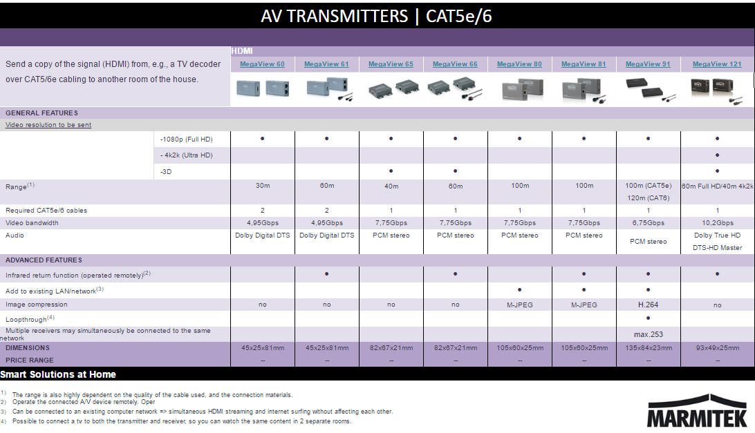 If the area to be covered is too large for a wireless video transmitter or an expensive HDMI cable and you wish to transmit a composite or (Ultra)HD signal (e.g. from your decoder), you can use CAT5 cabling in combination with a Marmitek solution. This is an affordable alternative for bridging large distances with minimum loss of quality. Marmitek video transmitters are suitable for every brand of DVD player, HDD recorder, satellite receiver, decoder, etc and are easy to install and use.