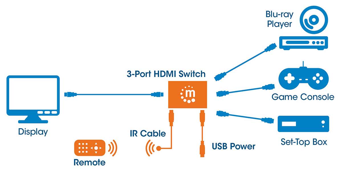 Manhattan's 4K HDMI Switch 3-Port allows you to connect three HDMI Ultra-High Definition (UHD) sources - such as game consoles, Blu-ray players, satellite receivers, digital recorders, decoders and more - to a 4HD UHD display.
