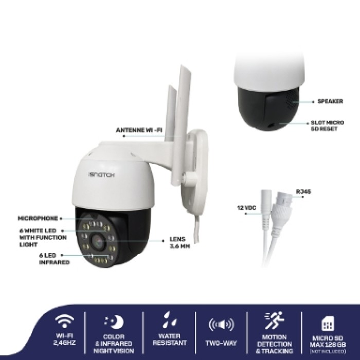 iSnatch HEYCAMMOVE PRO - 67.6894.36 HD 2K Outdoor Motorized WiFi Camera. HeyCam Move Pro works with the HeySmart app, which allows real-time viewing, taking photos, recording and exporting videos stored in memory. Also through the Application it is possible to use the Talk&Listen function thanks to the two-way sound.