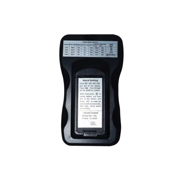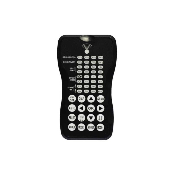 Remote control for Motion Detector adjustment. Multiple Adiustments (Sencitivity, Duration, Brightness, stby function etc.)Features