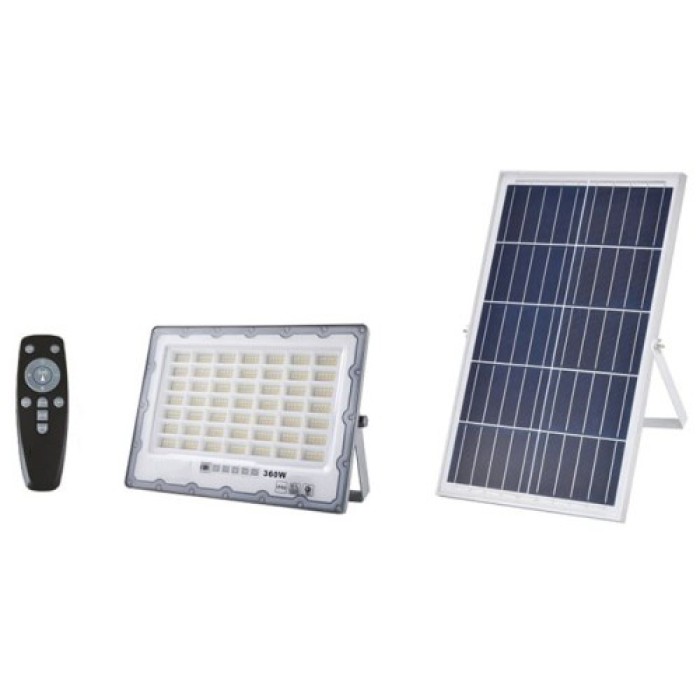 The solar floodlight has a built-in light sensor and is activated at sunset, as well as a wireless remote control for remote control. Save and take advantage of solar energy with the 360W LED solar projector, and illuminate your space easily and autonomously. Ideal solution for lighting, in cottages, gardens, entrances, garages, trees, outdoors, parking lots, tents, caravans, boats, warehouses, etc. The photovoltaic panel charges the rechargeable batteries included in the projector, so you have autonomous lighting overnight.