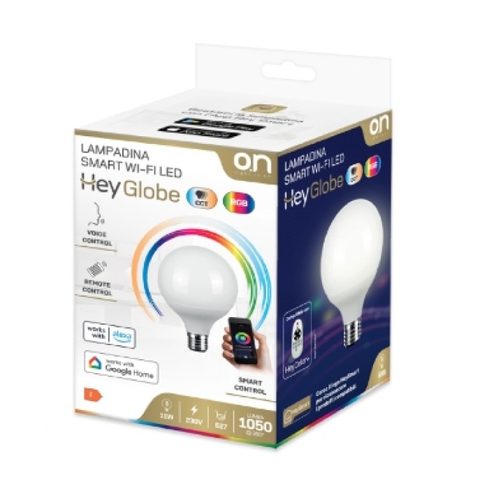 Smart WiFi LED spotlight Globe E27 G95 with dimmable lighting manageable by the HeySmart app for iOS and Android. Compatible with voice control from Amazon Alexa and Google Home. Compatible with the HeyColor+ remote control (code 211346).